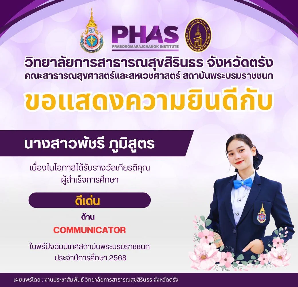 นักศึกษา ขอแสดงความยินดีกับ นางสาวพัชรี ภูมิสูตร เนื่องในโอกาสได้รับรางวัลเกียรติคุณ ผู้สำเร็จการศึกษา ดีเด่น ด้าน COMMUNICATOR ในพิธีปัจฉิมนิเทศสถาบันพระบรมราชชนก ประจำปีการศึกษา 2568 อ่านต่อ » กุมภาพันธ์ 19, 2026