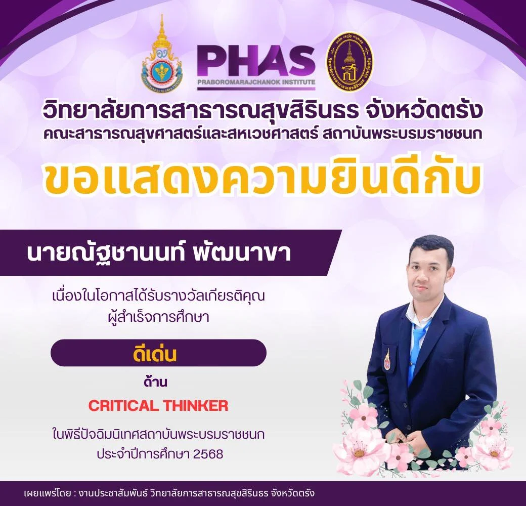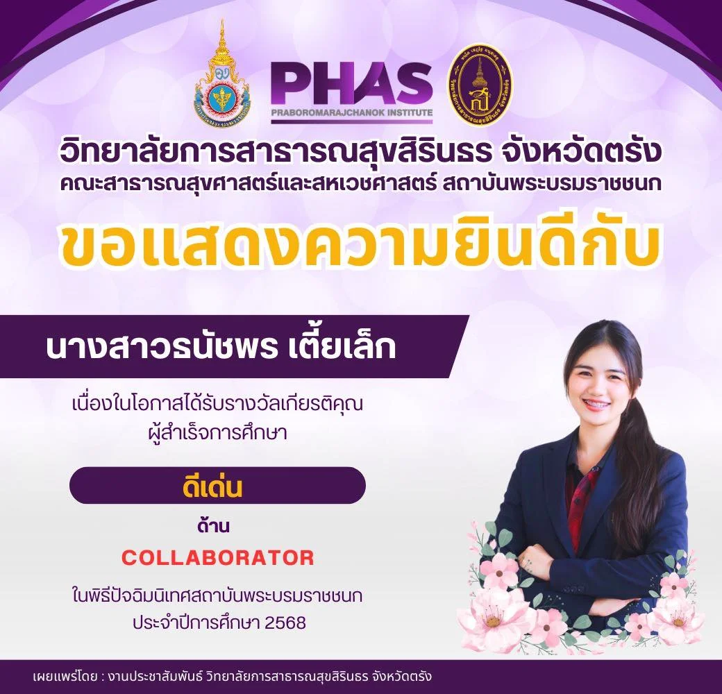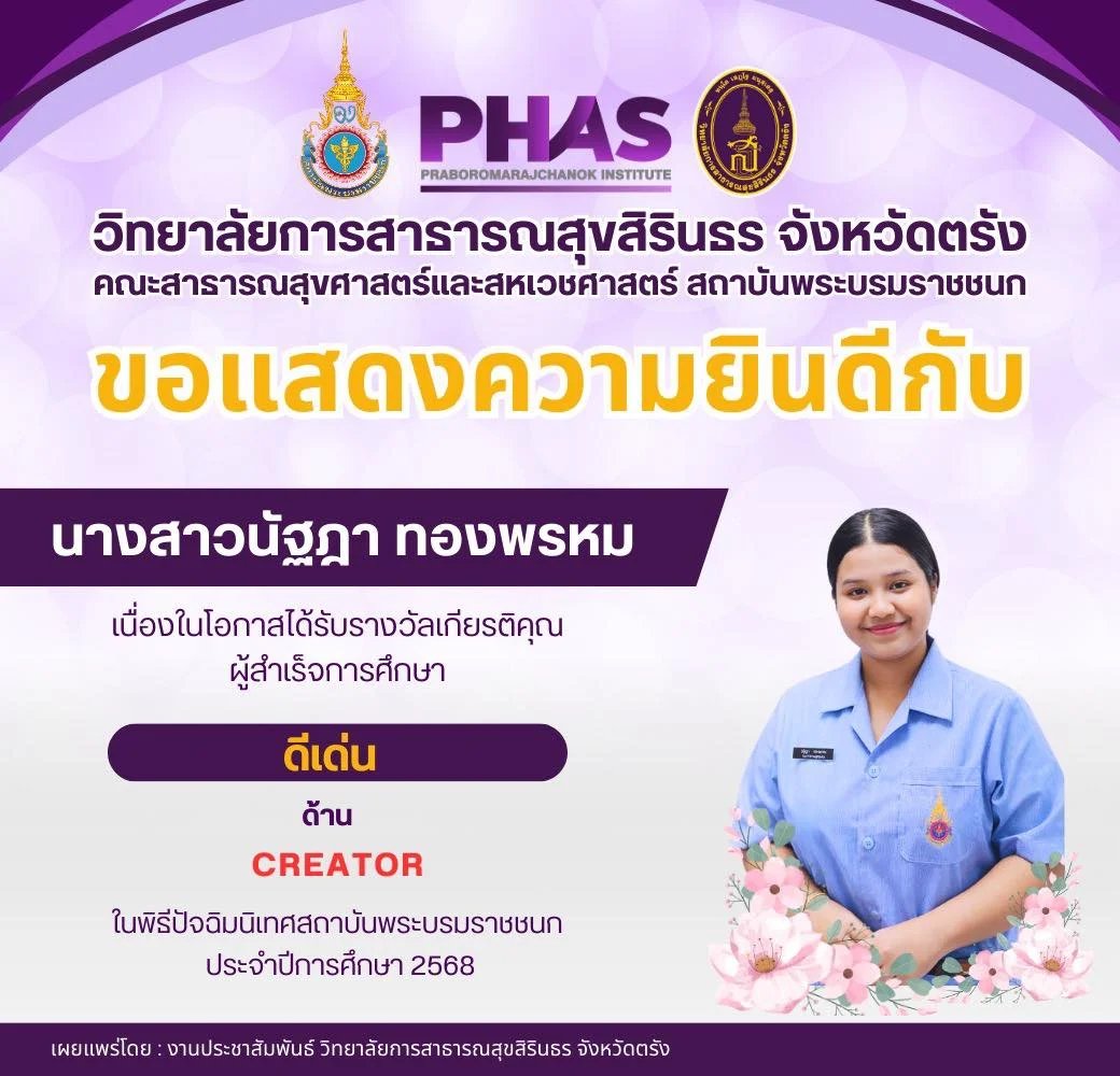นักศึกษา ขอแสดงความยินดีกับ นางสาวนัฐฎา ทองพรหม เนื่องในโอกาสได้รับรางวัลเกียรติคุณ ผู้สำเร็จการศึกษา ดีเด่น ด้าน CREATOR ในพิธีปัจฉิมนิเทศสถาบันพระบรมราชชนก ประจำปีการศึกษา 2568 อ่านต่อ » กุมภาพันธ์ 19, 2026