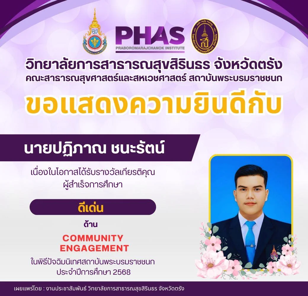 นักศึกษา ขอแสดงความยินดีกับ นายปฏิภาณ ชนะรัตน์ เนื่องในโอกาสได้รับรางวัลเกียรติคุณ ผู้สำเร็จการศึกษา ดีเด่น ด้าน COMMUNITY ENGAGEMENT ในพิธีปัจฉิมนิเทศสถาบันพระบรมราชชนก ประจำปีการศึกษา 2568 อ่านต่อ » กุมภาพันธ์ 19, 2026