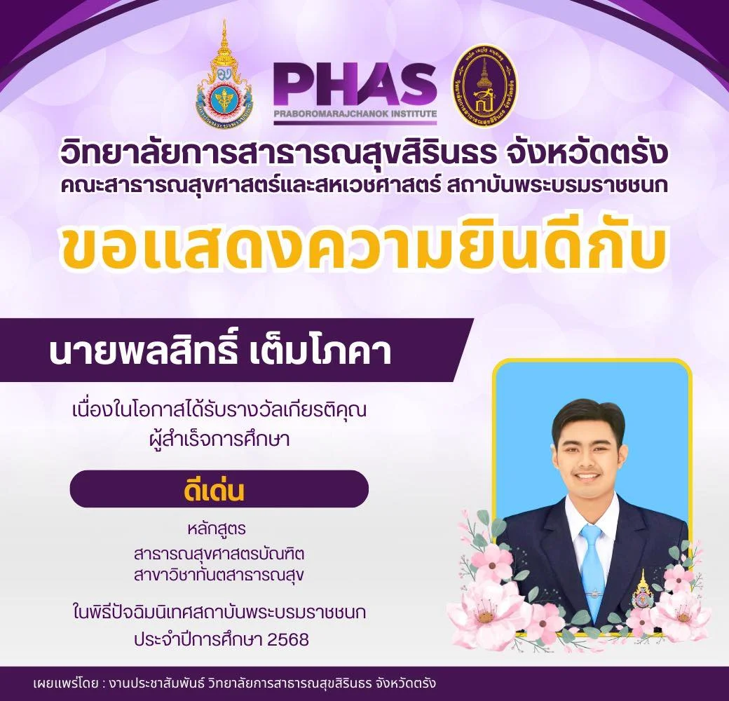 นักศึกษา ขอแสดงความยินดีกับ นางสาวณิชากานต์ เวชสิทธิ์ เนื่องในโอกาสได้รับรางวัลเกียรติคุณ ผู้สำเร็จการศึกษา ดีเด่น หลักสูตร สาธารณสุขศาสตรมหาบัณฑิต ในพิธีปัจฉิมนิเทศสถาบันพระบรมราชชนก ประจำปีการศึกษา 2568 อ่านต่อ » กุมภาพันธ์ 19, 2026
