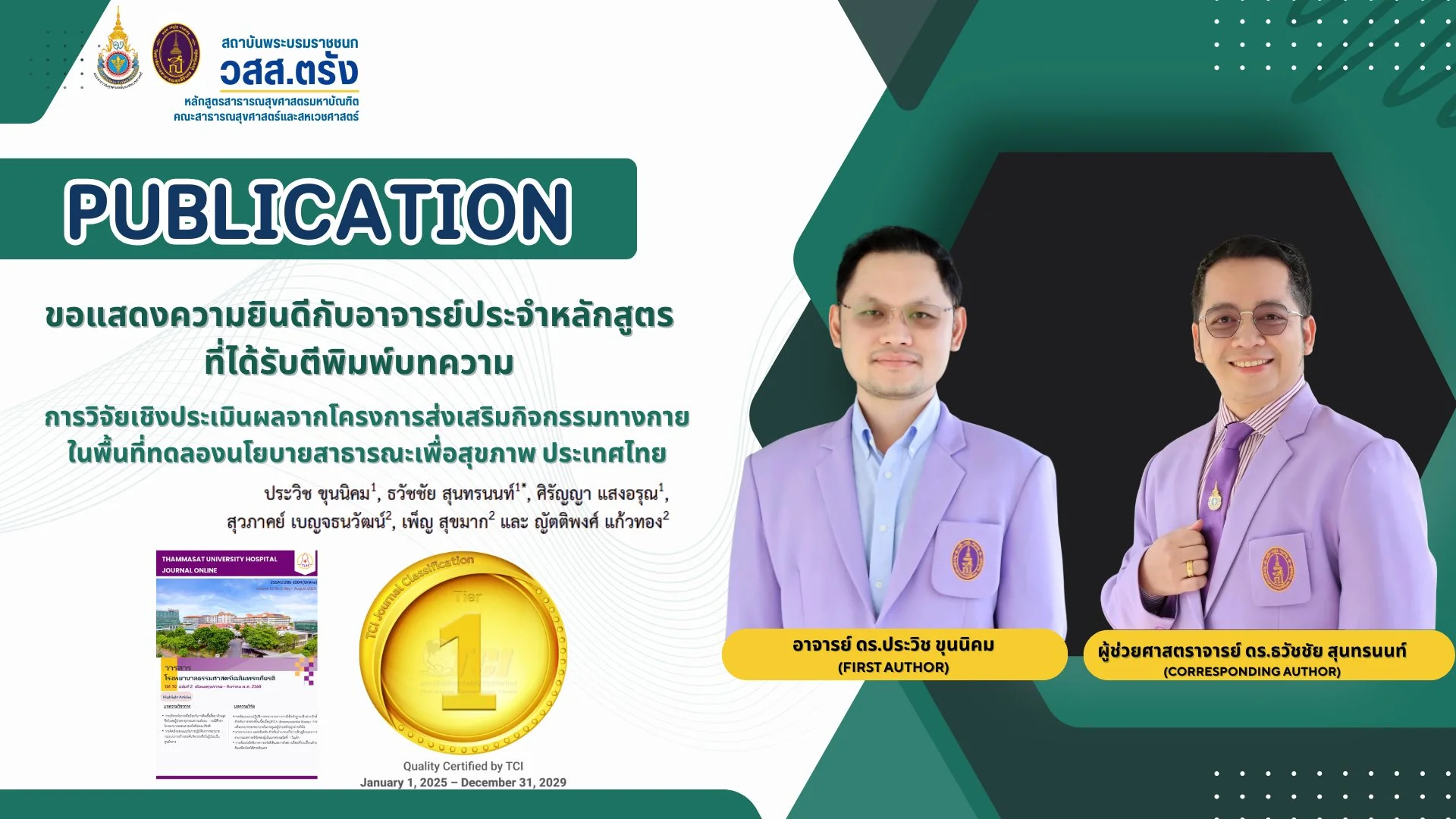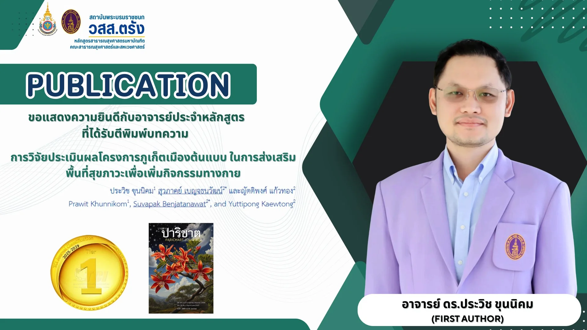 อาจารย์ ขอแสดงความยินดีกับอาจารย์ประจำหลักสูตรที่ได้รับตีพิมพ์บทความการวิจัยประเมินผลโครงการภูเก็ตเมืองต้นแบบ ในการส่งเสริมพื้นที่สุขภาวะเพื่อเพิ่มกิจกรรมทางกาย กุมภาพันธ์ 16, 2026 ไม่มีความเห็น