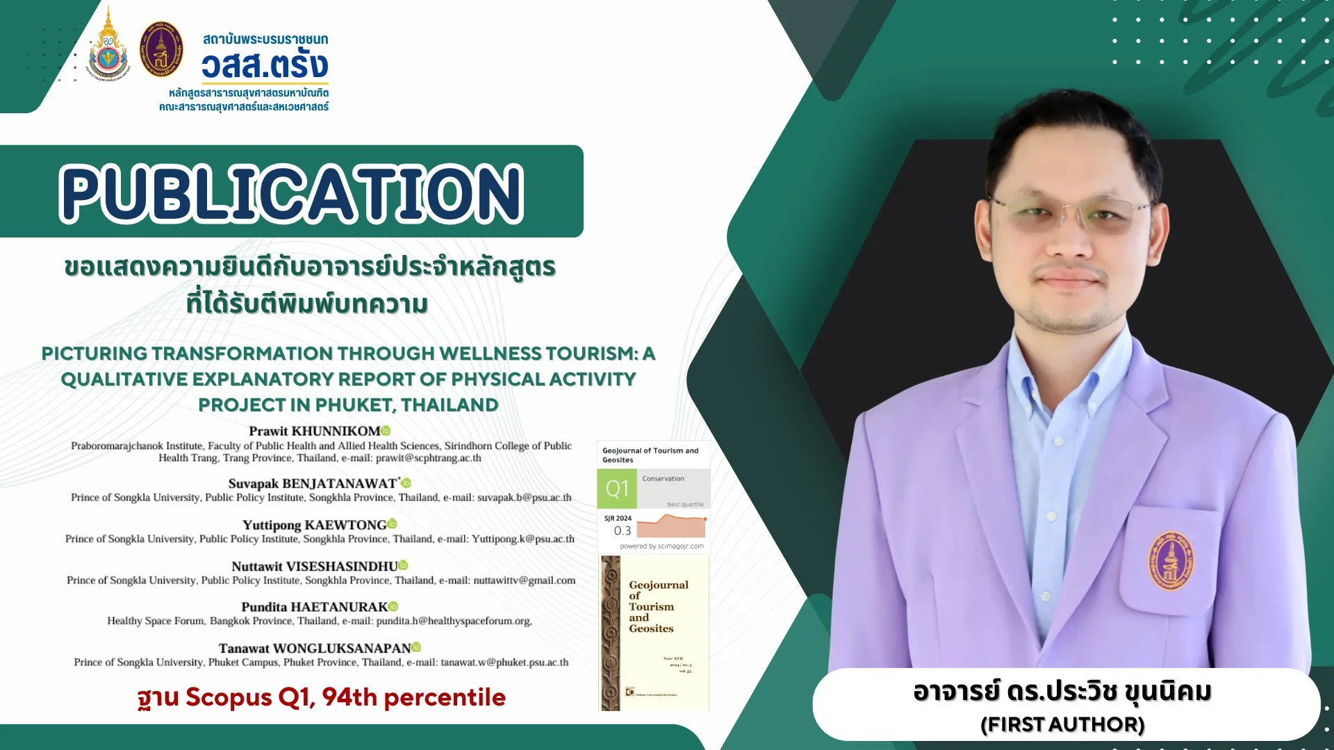 อาจารย์ ขอแสดงความยินดีกับอาจารย์ประจำหลักสูตรที่ได้รับตีพิมพ์บทความPICTURING TRANSFORMATION THROUGH WELLNESS TOURISM: AQUALITATIVE EXPLANATORY REPORT OF PHYSICAL ACTIVITYPROJECT IN PHUKET, THAILAND กุมภาพันธ์ 16, 2026 ไม่มีความเห็น