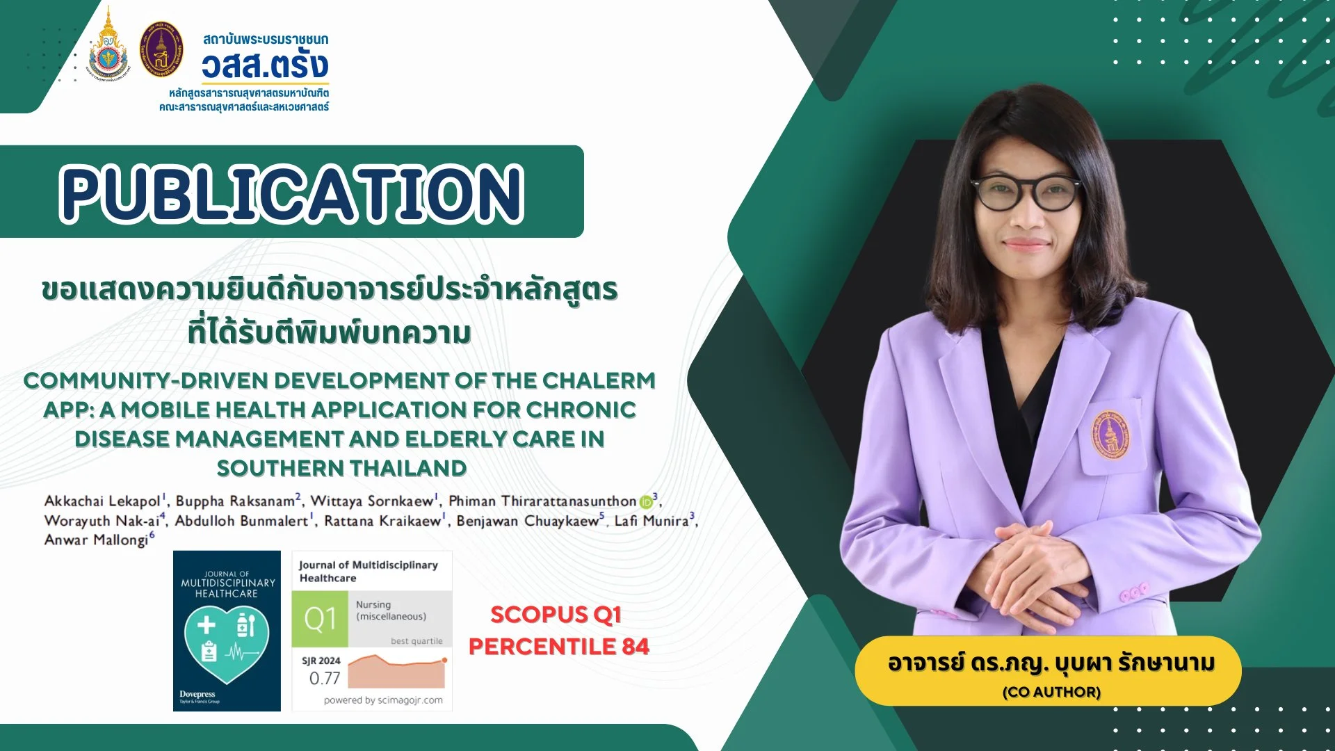 อาจารย์ ขอแสดงความยินดีกับอาจารย์ประจำหลักสูตรที่ได้รับตีพิมพ์บทความ COMMUNITY-DRIVEN DEVELOPMENT OF THE CHALERMAPP: A MOBILE HEALTH APPLICATION FOR CHRONICDISEASE MANAGEMENT AND ELDERLY CARE INSOUTHERN THAILAND กุมภาพันธ์ 16, 2026 ไม่มีความเห็น