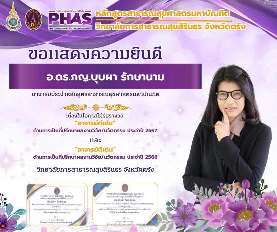 อาจารย์ ขอแสดงความยินดี อ.ดร.ภญ.บุบผา รักษานาม อาจารย์ประจำหลักสูตรสาธารณสุขศาสตรมหาบันฑิตเนื่องในโอกาสได้รับรางวัล”อาจารย์ดีเด่น”ด้านการเป็นที่ปรึกษาผลงานวิจัย/นวัตกรรม ประจำปี 2567และ”อาจารย์ดีเด่น”ด้านการเป็นที่ปรึกษาผลงานวิจัย/นวัตกรรม ประจำปี 2568 กุมภาพันธ์ 16, 2026 ไม่มีความเห็น