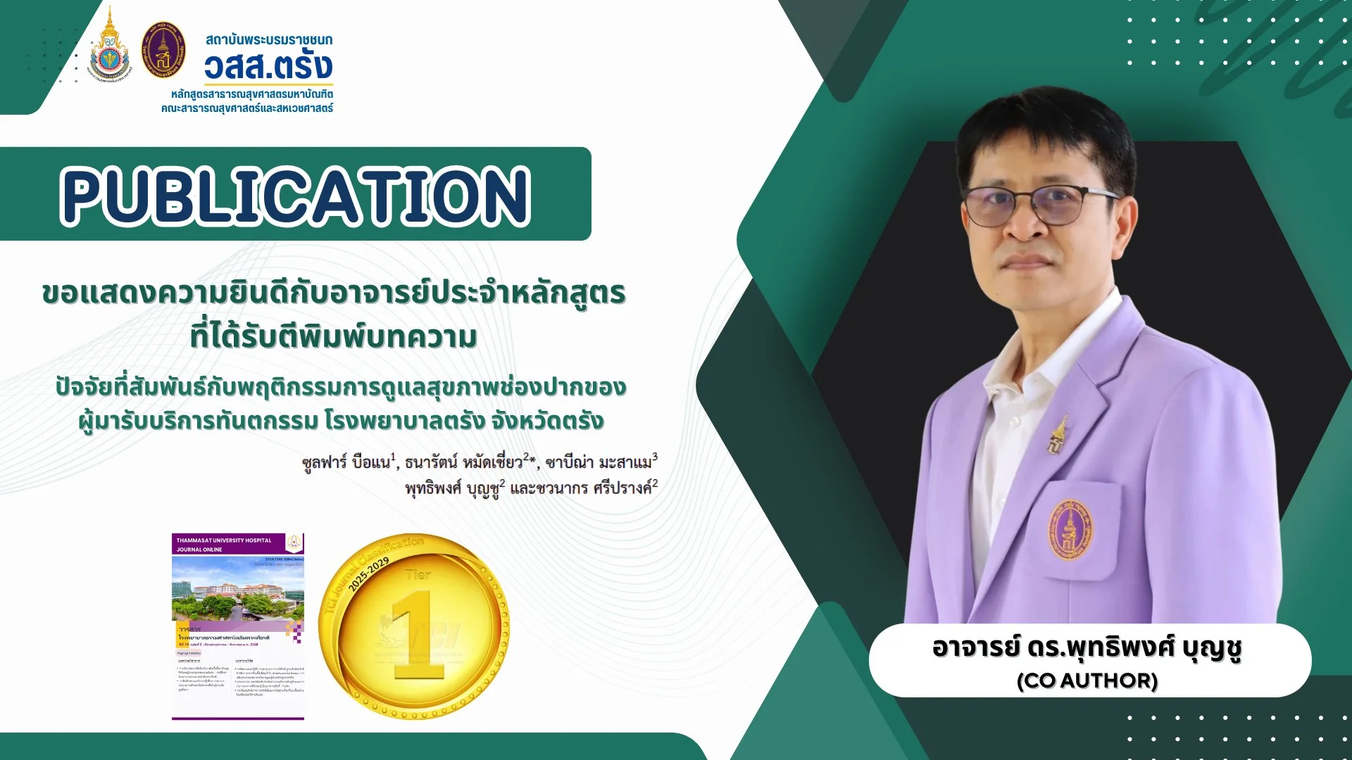 อาจารย์ ขอแสดงความยินดีอาจารย์ ดร.พุทธิพงศ์ บุญชู (FIRST AUTHOR) อาจารย์ประจำหลักสูตรสาธารณสุขศาสตรมหาบัณฑิตในไอกาสได้รับการตอบรับการตีพิมพ์บทความปัจจัยที่มีผลต่อพฤติกรรมการจัดการขยะมูลฝอยของคร้อเรือนในพื้นที่ชุมชนชายฝั่งปากแม่น้ำบ้านเกาะเคี่ยบตำบลกันต้งใต้ อำเภอกันกันตั้ง จังหวัดตรัง ประเทศไทย กุมภาพันธ์ 16, 2026 ไม่มีความเห็น