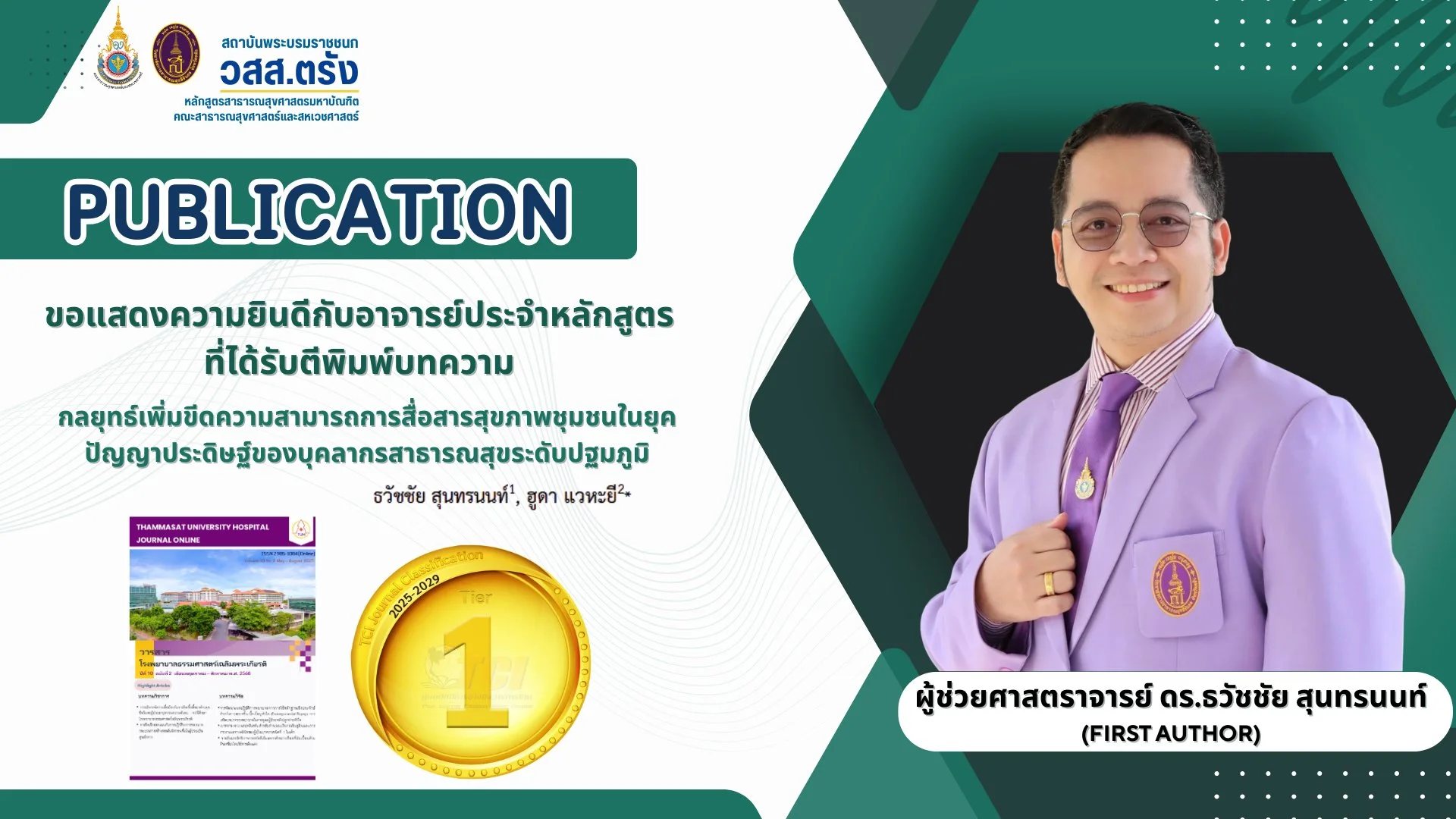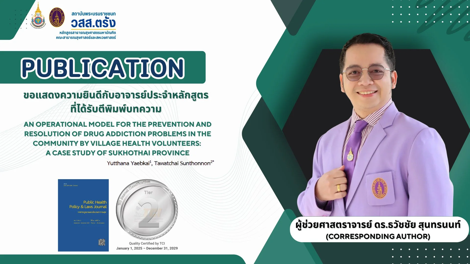 อาจารย์ ขอแสดงความยินดีกับอาจารย์ประจำหลักสูตรที่ได้รับตีพิมพ์บทความ AN OPERATIONAL MODEL FOR THE PREVENTION ANDRESOLUTION OF DRUG ADDICTION PROBLEMS IN THECOMMUNITY BY VILLAGE HEALTH VOLUNTEERS:A CASE STUDY OF SUKHOTHAI PROVINCE กุมภาพันธ์ 16, 2026 ไม่มีความเห็น