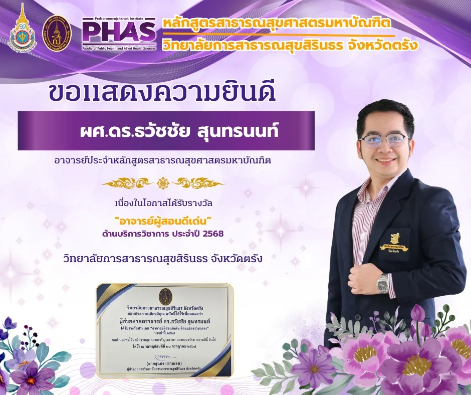 อาจารย์ ขอแสดงความยินดี ผศ.ดร.ธวัชชัย สุนทรนนท์ อาจารย์ประจำหลักสูตรสาธารณสุขศาสตรมหาบันฑิตเนื่องในโอกาสได้รับรางวัล”อาจารย์ผู้สอนดีเด่น”ด้านบริการวิชาการ ประจำปี 2568 กุมภาพันธ์ 16, 2026 ไม่มีความเห็น