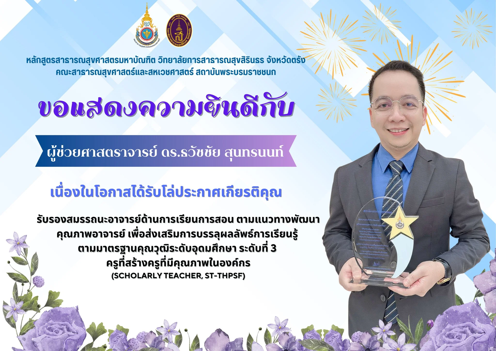 อาจารย์ ขอแสดงความยินดีกับผู้ช่วยศาสตราจารย์ ดร.ธวัชชัย สุนทรนนท์เนื่องในโอกาสได้รับโล่ประกาศเกียรติคุณรับรองสมรรถนะอาจารย์ด้านการเรียนการสอน ตามแนวทางพัฒนาคุณภาพอาจารย์ เพื่อส่งเสริมการบรรลุผลลัพธ์การเรียนรู้ตามมาตรฐานคุณวุฒิระดับอุดมศึกษา ระดับที่ 3ครูที่สร้างครูที่มีคุณภาพในองค์กร(SCHOLARLY TEACHER, ST-THPSF) กุมภาพันธ์ 16, 2026 ไม่มีความเห็น